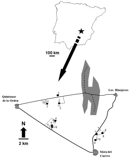 Field work was carried out near the localities of Quintanar de la Orden–Mota del Cuervo–Los Hinojosos (Toledo–Cuenca provinces; 30S 5080, UTM 43790; Figure 1). The landscape is composed of dry cereals and legume croplands, with scattered small grape and olive groves (Figure 1). The original Holm oak, Quercus ilex, forest covers 28% of the study area only, and it is distributed as fragments of a wide variety of extensions. Holm oaks dominate the tree layer, whereas the understory shrub layer is composed of species in the genera Genista, Asparagus, Rhamnus, and Quercus. Annual crops are harvested in midsummer (June–July), and perennial crops in autumn–winter, whereas the natural vegetation produces fruits in autumn, after the summer drought typical of Mediterranean climates. Hence, food availability in the landscape peaks in autumn rather than in summer, as happens in other temperate climates, due to the effects of drought (see [30] and references therein for a full description).