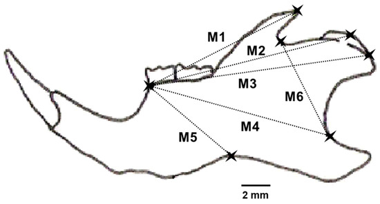 Drawing of the left lower mandible of Apodemus sylvaticus showing landmarks and the six distances (M1–M6) selected to characterize the individual fluctuating asymmetry in mandible size of the individuals caught (modified from [38]).