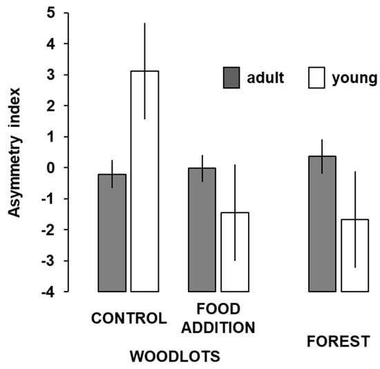 Mean (±SE) values of the asymmetry index of wood mice, Apodemus sylvaticus, according to age and forest treatment (nadults = 28, 29, and 18; njuvenile= 3, 3, and 3; control, food-supplemented woodlots and forest, respectively).