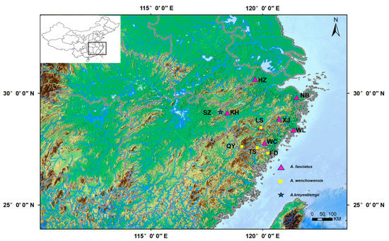 - Yang, J.Q.; Tang, W.Q.; Liao, T.Y.; Sun, Y.; Zhou, Z.C.; Han, C.C.; Liu, D.; Lin, H.D. Phylogeographical analysis on Squalidus argentatus recapitulates historical landscapes and drainage evolution on the island of Taiwan and mainland China. Int. J. Mol. Sci. 2012, 13, 1405–1425. [Google Scholar] [CrossRef]