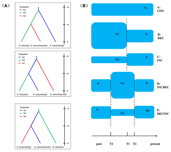| Scenario I: three species groups (A. fasciatus, A. wenchowensis and A. kreyenbergii) | |||