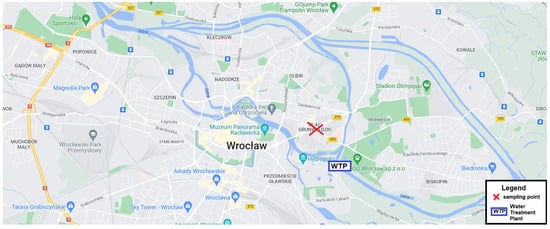 The location of the sampling point and the water treatment plant providing tap water (the distance of about 2 km), source: https://www.google.pl/maps, accessed on 20 January 2023.