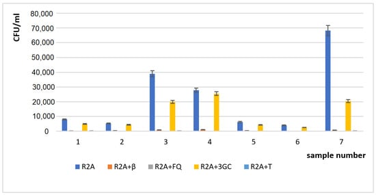 In general, among all types of resistant bacteria tested in the current study, the most abundant were bacteria resistant to ceftazidime (3GC), reaching more than 90% of HPC in sample 4. In some samples, bacteria resistant to amoxicillin (β) were observed, while bacteria resistant to ciprofloxacin and tetracycline were absent or present only as single colonies (even in the non-diluted suspensions).