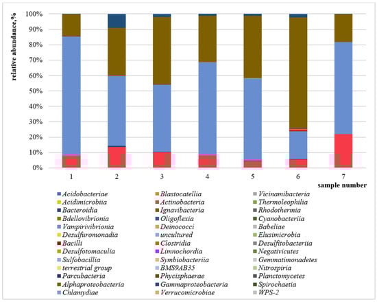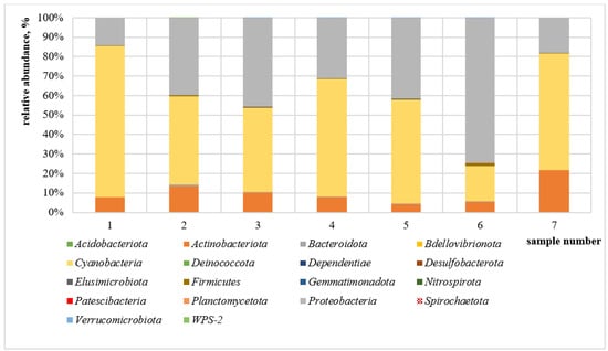 The most common phylum in the samples was Cyanobacteria (17.86–77.71%), followed by Proteobacteria (up to 74.40% in sample 6, collected in May) and Actinobacteriota (up to 21.85% in sample 7, collected in June). Detailed information of each sample composition at the phylum level is presented in Figure 4. At the class level, three leading taxa could be observed: Vampirivibrionia, Alphaproteobacteria, and Actinobacteria, as presented in Figure 5. In addition, the Mycobacterium genus was detected in each sample ranging from 4.37% (sample 5) to 21.81% (sample 7). The identified Mycobacterium genera are considered to be non-tuberculous mycobacteria, commonly found in water, air and soil.