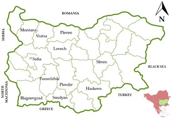 Bulgaria occupies the central part of the Balkan Peninsula, Southeast Europe, bordering Romania (Danube River) to the north, Serbia and North Macedonia to the west, Greece and Turkey in Europe to the south, and the Black Sea to the east. The Balkan Mountain range, sprawling from West to the East, separates Bulgaria in northern and southern parts, thus impacting both the temperature and precipitation on both sides of the mountain. To the north, the climate is typical continental, while the southernmost lower parts of Bulgaria exhibit some Mediterranean features [68]. The territory elevation ranges substantially—from sea level to 2925 m. The territory of Bulgaria belongs to several biogeographical regions; therefore, the vascular flora is diverse and comprises 4064 species of spermatophytes affiliated to 921 genera and 159 families [69]. The arable land comprises about 50% of the country’s territory, while forests account for 42%. There is an ongoing trend of arable land abandonment due to biophysical and economic factors [70]. Currently (2021), the urban population prevails, being nearly 3 times larger than the rural one [71].
