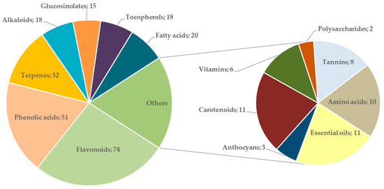 Most commonly found biologically active compounds typical for the consumed taxa belonged to polyphenols—mainly flavonoids and phenolic acids and their derivatives, respectively, 74% and 51% of the taxa (Figure 6). Other important nutritives, such as fatty acids (20%), tocopherols (18%), and carotenoids (11%), were reported. Details on major metabolites and toxic substances in spring edible ruderals consumed traditionally in Bulgaria are presented in Supplementary Table S1. Quercetin, kaempferol, apigenin, and their derivatives and caffeic, p-coumaric, and chlorogenic acids were most frequently reported among the flavonoids and phenolic acids, respectively. Their numerous biological activities are proven by in vitro and in vivo tests and comprise antimicrobial, antioxidant, and wound-healing activities; reduce the risk of myocardial infarction, cancer development, have anti-inflammatory, and immunomodulatory functions; and protect the central nervous system and others [112,113,114,115,117].