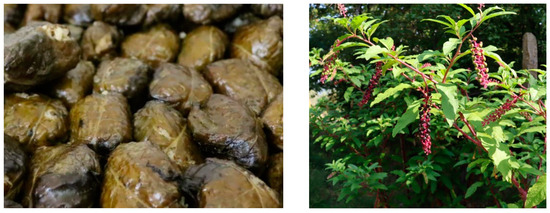 While different approaches, e.g., cooking or steeping in water before preparation, to eliminate or at least reduce the amount of toxic compounds are well documented in the Mediterranean area, Bulgarian ethnographical sources claim that “poisonous plants” were taboo in the traditional cuisine [25,39,180]. This could be related also to the rare use of cooked or blanched vegetables as salads and/or snacks in Bulgaria that was confirmed during our field studies where only blanched branch shoots of Pistacia terebinthus L. were presented in a salad form. About 41% of the currently listed taxa are reported to be non-toxic, and, in many cases, the reported toxicity for certain species was related to parts which were not consumed, or it is related to alkaloids, saponins, or glucosides that are in relatively small amounts in the seedlings or shoots during the collection time. Another case was the use of the leaves of Phytolacca americana L. for the preparation of sarmi (green leaves stuffed with a mixture of rice, chopped allium, and spices). The vegetative parts of the plant contain saponins (mainly phytolaccatoxin and phytolaccagenin) in greater amounts than in the fruits and was known to cause stomach and intestinal discomfort if not properly cooked [181]. The first application of this invasive weed was related to the use of its pokeberries for fortification of the wine color and is also reflected in the Bulgarian name of the plant amerikanski winoboj (American wine-colorant) [80]. Still, when the participants from the local community in Belasitsa Mt. talked about the use of the leaves of P. americana for sarmi preparation, they used another colloquial name, butima (Figure 7). The leaves are used either fresh in spring—soaked in hot water boiled after they are stuffed with the filling—or dried and stored for later on. In the latter case, the leaves are again soaked in hot water and then cooked until ready.