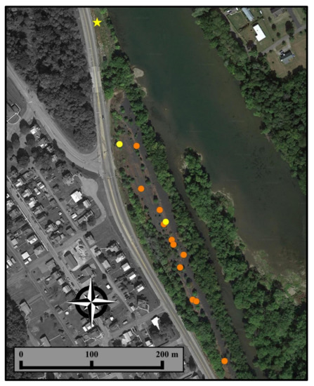 Our study is part of a long-term investigation of the ecology of Northern Map Turtles at Mount Union [18,19,20,23]. The Mount Union site consists of two very distinct areas of turtle nesting habitat: (1) ~500 m long by 40–70 m wide pile of coal tailings; and (2) ~1000 m3 area of sand and shale within a 1150 m chain-link-fenced area, constructed by the Pennsylvania Department of Transportation to mitigate road mortality of female turtles along the adjacent highway (Figure 1).