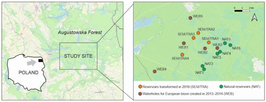 - Six natural water reservoirs detected near artificial/transformed waterholes for European bison. Waterholes for European bison are usually created in places where natural water reservoirs [] are not available; therefore, natural reservoirs located as close as possible to artificial/transformed waterholes for European bison were selected for comparative studies. The reservoirs were named NAT. Natural reservoirs were either ephemeral or heavily overgrown and significantly shaded.
