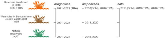 The study was conducted in three consecutive years, 2018, 2019, and 2020, and covered four seminatural reservoirs: SEM (study conducted in 2018), and the four reservoirs transformed (TRA, study conducted in 2019 and 2020) (Figure 2). The field study was carried out each year in three seasons: spring, summer, and autumn. Such a work schedule allowed us to record the activity of bats during spring migrations, the creation of breeding colonies, reproduction, colony breakdown, and the beginning of autumn migrations []. The following methods were used in the field: