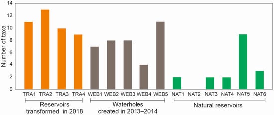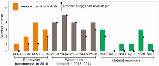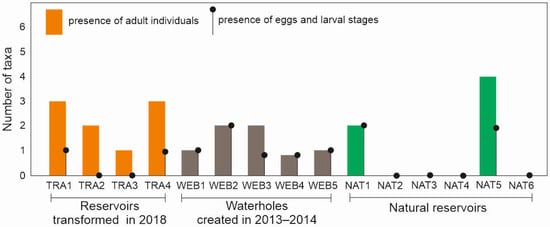A total of 24 species of dragonflies (Odonata) were recorded, but full development, considered certain or probable, was observed in 14 species in at least one reservoir (Table S2, Figure 3). In total, 9–13 taxa were found in reservoirs constructed in 2018 (on average, 11 taxa per reservoir), 4–11 taxa (on average, eight taxa per reservoir) on WEB reservoirs, and zero to nine taxa (on average, three taxa per reservoir) on NAT reservoirs. Within the WEB2 reservoir, 13 taxa were recorded, which is the highest number found in the context of the studied sites. Among the three groups of reservoirs, the fewest taxa were found in natural reservoirs, with no dragonflies found in reservoir NAT2. Only the NAT6 reservoir was distinguished by a relatively high number of nine species, a number comparable to or even higher than some European bison waterholes, while the other natural reservoirs presented much lower values (Figure 3).