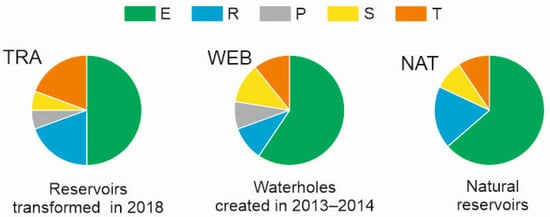 The higher-than-average number of dragonfly species in European bison waterholes compared to natural reservoirs suggests that waterholes play a role in increasing local biodiversity in forest ecosystems. The differences in the number of recorded species and the diversity of ecological elements of the dragonfly fauna in the three groups of reservoirs are related to the habitat features of these reservoirs. The number of species found in the studied reservoirs seems to be relatively small, although further research would most likely allow for the detection of more species. Capturing a representative spectrum of adult odonate richness at a single site is dependent on the number of surveys []. The relatively small number of species may also be related to the small area of individual reservoirs, as the diversity of odonatofauna is positively correlated with the size of the habitat [,]. A higher average number of species in TRA reservoirs (transformed in 2018), compared to the waterholes for European bison (WEB), may indicate that their usefulness for the odonatofauna is decreasing over time.