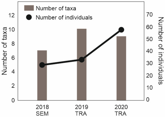 In 2020, the number of species was similar to 2019 (TRA reservoirs), and higher than in 2018 (SEM reservoirs) before the transformation (Figure 7). More pronounced differences were found in the number of individuals, which showed a two-fold increase in 2020 compared to 2018 (Figure 7).