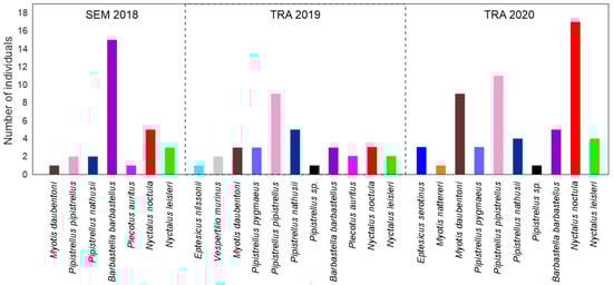 In 2018, 29 individuals belonging to 7 species of bats were caught near the SEM reservoirs (Myotis daubentonii, Pipistrellus pispistrellus, Pipistrellus nathusii, Barbastella barbastellus, Plecotus auritus, Nyctalus noctula, and Nyctalus leisleri). In 2019, after transformation into waterholes for European bison (TRA), 33 bats of 10 species were caught (Eptesicus nilssonii, Vespertilio murinus, Myotis daubentonii, Pipistrellus pygmaeus, Pipistrellus pispistrellus, Pipistrellus nathusii, Barbastella barbastellus, Plecotus auritus, Nyctalus noctula, Nyctalus leisleri, and 1 individual classified to the genus Pipistrellus spp.). In 2020, 58 individuals belonging to 9 species were caught (Eptesicus serotinus, Myotis nattereri, Myotis daubentonii, Pipistrellus pygmaeus, Pipistrellus pispistrellus, Pipistrellus nathusii, Barbastella barbastellus, Nyctalus noctula, Nyctalus leisleri, and one individual classified to the genus Pipistrellus spp.) (Figure 8).