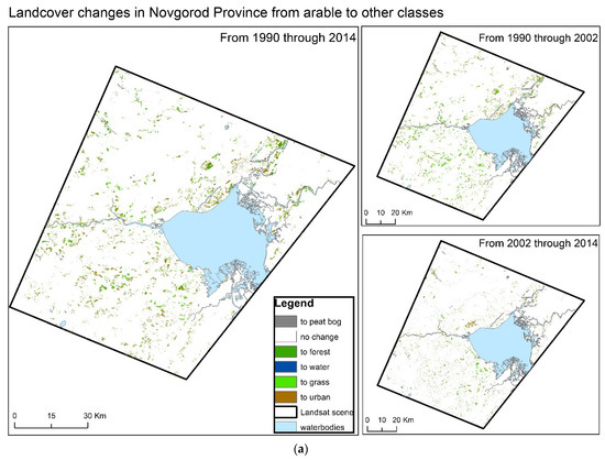 (a) Difference map calculated from the Landsat scenes in Novgorod Province. The map on the left features transition from arable landcover to all other classes, 1990–2014. The two smaller maps on the right highlight similar transitions 1990–2002 (upper) and 2002–2014 (lower). (b) Difference map calculated from the Landsat scenes in Novgorod Province. The map on the left features transition from grass landcover to all other classes, 1990–2014. The two smaller maps on the right highlight similar transitions 1990–2002 (upper) and 2002–2014 (lower).