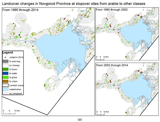 The total number of pixels in the Yaroslavl/Tver scene (Figure 1) was 29.52 M, and in Novgorod 12.48 M, for a combined area of 42.00 M pixels. Each pixel represented a 30 m × 30 m area, so the total area was 37,800 km2. The changes in land cover classes between 1990 and 2002, and between 2002 and 2014 were shown in ‘difference maps’, illustrating which and how each pixel changed LCC. The difference maps are depicted in Figure 3a,b and Figure 4a,b for the Novgorod scene and stopover sites, respectively.