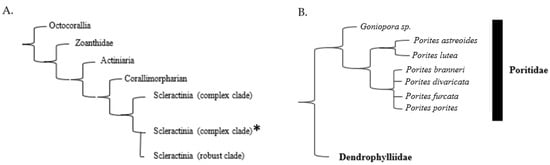 (A) Generalized taxonomic summary of the coral subclass Hexacorallia. Clade location of Poritidae is indicated with asterisks (B) A generalized phylogenetic tree, based on species with available mitochondrial sequence data. Porites astreoides is found within Poritidae (indicated with a black bar). Adapted from Kitahara et al., 2010 [].