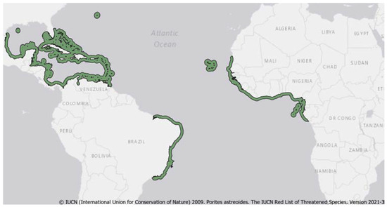 Geographic distribution of the mustard hill coral (Porites astreoides) in the Atlantic Ocean, indicated in green [].