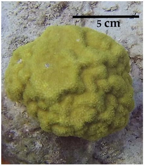 Porites astreoides colonies reach maturity at approximately 8–10 years of age, as reported by the ‘Coral Trait Database’ []. Field monitoring of individual colonies of P. astreoides has shown that the production of gametes can begin at a colony size of 2–4 cm2 []. As a member of the family Poritidae, P. astreoides contains many small corallites filled with septa []. Polyp density is ~18 polyps/cm2, with each corallite 1.2–1.6 mm in diameter [].