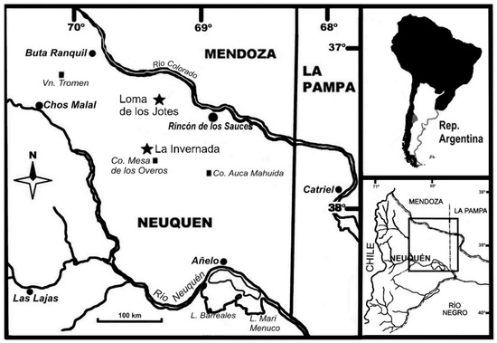 - Leanza, H.A.; Hugo, C.A. Cretaceous red beds from southern Neuquén Basin (Argentina): Age, distribution and stratigraphic discontinuities. Publicación Electrónica De La Asoc. Paleontológica Argent. 2001, 7, 117–122. [Google Scholar]