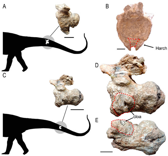 Caudal vertebrae showing the delimitation of the pathological area: (A) localization of MAU-Pv-LI-601 within a graphical scheme of the tail of an indeterminate sauropod; and (B) an anterior view of the vertebral centrum; (C) MAU-Pv-LJ-472/1 located within the graphical scheme of the tail; (D) MAU-Pv-LJ-472/1 in lateral view and (E) in ventral view. The extent of pathological tissue on the vertebral surface is marked by a red dashed line; the cloaca is marked by a black arrow in lateral view (D) and by a black dashed line in ventral view (E). The haemal arch is marked by a black arrow in the anterior view (B). Abbreviations: Cloa, cloaca; Harch, haemal arch. Scale bars equal 5 cm in (A,C) and 3 cm in (B,D,E).
