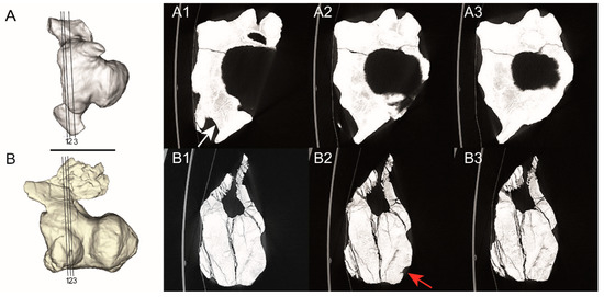 3D models of the caudal vertebrae and the sequence of CT scan images in the serial axial section for MAU-Pv-LI-601 (A) and MAU-Pv-LJ-472/1 (B). (A1–A3) corresponding to the proximal end of the vertebral centrum MAU-Pv-L I-601 and (B1–B3) corresponding to the proximal end of the vertebral centrum of MAU-Pv-L J-472/1. In (A1) the pathological tissue is marked by a white arrow, and in (B2) the cloaca is marked by a red arrow. Scale bars equal 10 cm.