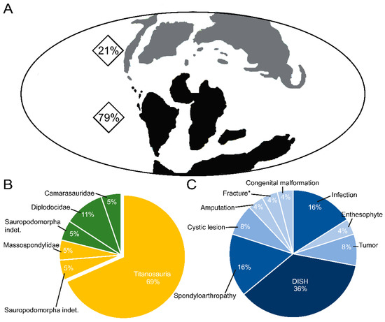 Distribution of pathologies associated with sauropod dinosaur tails: (A) percentage by supercontinents (Laurasia and Gondwana), (B) pie chart of the pathologies analyzed by clade, and (C) by disease. *, presence of fracture associated with a haemal arch.