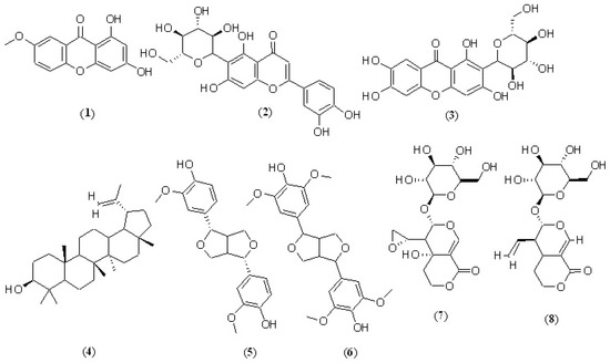 Candidate Gentian compounds with skin regeneration and wound-healing potential. isogentisin (1), isoorientin (2), mangiferin (3), lupeol (4), pinoresinol (5), syringaresinol (6), eustomoside (7), and sweroside (8).