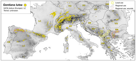 - European Environment Agency. Gentiana lutea L. Available online: https://eunis.eea.europa.eu/species/172882 (accessed on 15 June 2022).