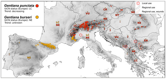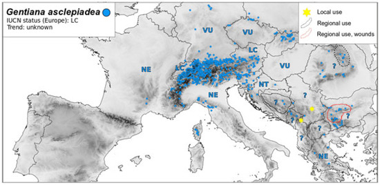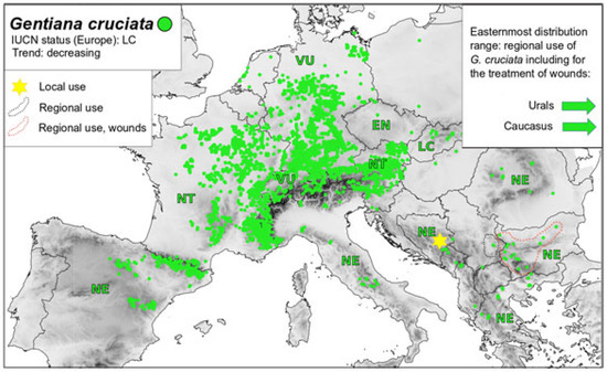 We accessed Google Scholar, Web of Science, and PubMed to identify publications for the period 1960–2022 with the search string: “Gentiana + ethnobotany”, “Gentiana + wounds”, “Gentiana + secondary metabolites”, “iridoid(s)” “secoiridoid(s)”, “flavonoid(s)”, “alkaloid(s)”, “xanthone(s)”, “lignans”, etc. Following the PRISMA 2000 guidelines, the records were assessed for eligibility, and the inappropriate ones were excluded. In addition, the Latin version of the text of Dioscorides was checked for the application of “gentian” as well as some local ethnobotanical publications [19,20,21,22,23,24,25,26,27,28,29,30]. Additionally, distribution maps were built for five species found to have applications to cure wounds, together with their IUCN conservation status assessments.