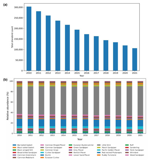 (a) The total count of the shorebird population, showing a steady decline over the years in the study area; (b) the relative abundance of shorebirds (%) in entire individual sites in relation to the year.