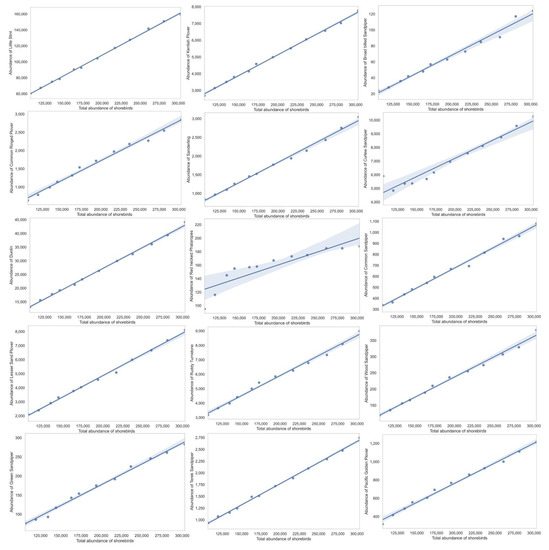 The Shannon–Weiner diversity index and the Gini-Simpson index were used to assess the changes in diversity, and the Margalef index was employed to check the species richness. A one-way ANOVA was run to determine the differences in the Margalef richness index, and Tukey’s post hoc multiple comparisons test was used to test the diversity changes. Confidence limits were calculated and pairwise comparisons between years for each diversity index were carried out using bootstrap methods with replacement, using PAST version 4.03 [31]. Linear regressions were carried out to test the population trends of each of the 27 analyzed shorebird species. ANOVA and regression analyses were performed using R version 4.0.5 [32]. Significance for all statistical tests was set at 0.05.