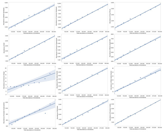 Shannon–Weiner index values ranged between 1.81 and 1.91, with significant variation between the years and a generally declining trend, although a slight fluctuation was reported from 2014 to 2017 (Table 2, bootstrap, p<0.05 in all pairwise comparisons between years). Margalef richness index varied between 2.13 and 2.31, indicating a gradual increase in the species richness over the years (Table 2). The Gini–Simpson index values ranged between 0.66 and 0.70, with significant fluctuations occurring between years and a declining trend. Five species represented 77% or more of the total wintering shorebird population, namely, Little Stint, Dunlin, Curlew Sandpiper, Common Redshank, and Marsh Sandpiper (Tringa stagnatilis) (Table 3). Little Stint was the most dominant species (54.26% of total shorebirds) throughout the duration of the study (Table 3). Although all the shorebirds we assessed exhibited declining trends over the years (Figure 3 and Figure 4, Table 3, p < 0.05 in all cases), eight species among them, namely, Wood Sandpiper (Tringa glareola), Terek Sandpiper (Xenus cinereus), Sanderling (Calidris alba), Red-necked Phalarope (Phalaropus lobatus), Pacific Golden Plover (Pluvialis fulva), Green Sandpiper (Tringa ochropus), Eurasian Oystercatcher, Common Snipe (Gallinago gallinago), Common Sandpiper (Actitis hypoleucos), Common ringed Plover (Charadrius hiaticula), Broad-billed Sandpiper (Limicola falcinellus), and Black-tailed Godwit, exhibited less than 1% relative abundance (Figure 3b).