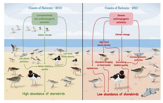 Among the 27 species of shorebirds showing a significant downward trend in abundance, ten of them were observed feeding on discarded food waste during the study period, especially in the Busaiteen region (Figure 6). These were Little Stint, Dunlin, Curlew Sandpiper, Broad-billed Sandpiper, Ruddy Turnstone, Grey Plover, Common Redshank, Common Greenshank, Eurasian Curlew, and Bar-tailed Godwit. Although direct evidence is sparse due to a lack of studies, this alteration from their specialized diet will induce negative effects on shorebirds’ physiology in the long term due to the gradual accumulation of harmful chemicals. Effluents containing high levels of ammonia, nitrate, phosphate, and other heavy metals are discharged from sewage treatment plants in the Tubli bay and cause reductions in the biodiversity, richness, and evenness of macrobenthos [53]. A similar impact can be observed in areas adjacent to seawater desalination plants, where high-temperature discharged brine water with containing heavy metals and other chemical pollutants limits the survival of most macrobenthos, except for a few opportunistic species [53]. This change in the community structure of key prey items, such as polychaetes and crabs, might have accounted for the diversity changes in the shorebird population along the coasts of Bahrain.