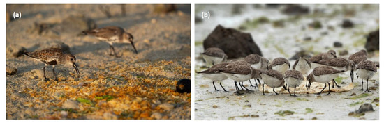 In order to successfully finish their extraordinary long-distance migration flights, constrained within a narrow window of time, shorebirds must accumulate large fuel reserves in the form of fat and protein [8]. Hence, the critical wintering and stop-over sites of shorebirds are characterized by increased primary productivity and high abundance of macrobenthic prey items, which are favorably influenced by suitable environmental variables, organic matter, and nutrients from terrestrial and marine sources [9,10]. Thus, for successful migration, they require high-quality wintering and stop-over sites that allow efficient and opportunistic foraging strategies for refueling which, thus, ensure the survival and timely departure of the migratory shorebirds from wintering sites [11]. Food preferences and foraging strategies adopted by different species vary considerably [12], which has important implications on the effect of habitat degradation.
