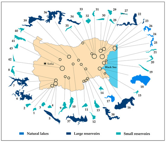 Map of Bulgaria (modified after [50,51]) with locations of the studied waterbodies and indication of their type. The waterbodies are represented by numbers that follow those in Table 1.