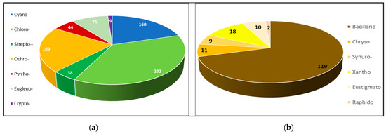The total biodiversity of the phytoplankton comprised 787 species from seven phyla (Figure 2a). Green algae were represented by the highest number of species (330) with a predominance of taxa from the phylum Chlorophyta (292) and less from the second green phylum—Streptophyta (38). Cyanoprokaryota, represented with 160 species, occupied the second place in the total taxonomic structure, followed by Ochrophyta, Euglenophyta, Pyrrhophyta and Cryptophyta (Figure 2a). Among Ochrophyta (169 taxa), diatoms (class Bacillariophyceae) were the most diverse (119), while all other classes of this large phylum (Chrysophyceae, Synurophyceae, Xanthophyceae, Eustigmatophyceae, Raphidophyceae) contained much less species (Figure 2b).