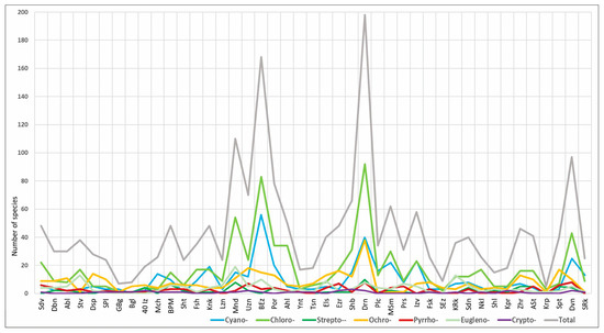 Total number of species in comparison with number of species in the main taxonomic phyla in the summer phytoplankton of 43 Bulgarian waterbodies (abbreviations follow those in Table 1): Cyano—Cyanoprokaryota, Chloro—Chlorophyta, Strepto—Streptophyta, Pyrrho—Pyrrhophyta, Eugleno—Euglenophyta, Ochro—Ochrophyta and Crypto—Cryptophyta.