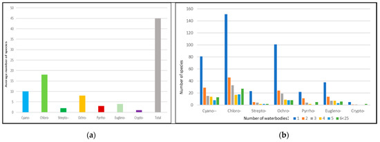 (a) Average number of species—total and in the main taxonomic phyla—in the summer phytoplankton of 43 Bulgarian waterbodies; (b) distribution of species from main phyla by number of waterbodies (1, 2, 3, 4, 5, and 6–25) in which they were found. For better visibility, the number of species found in more than 5 waterbodies (6 to 25) is summarized in a common group. Legend: Cyano—Cyanoprokaryota, Chloro—Chlorophyta, Strepto—Streptophyta, Pyrrho—Pyrrhophyta, Eugleno—Euglenophyta, Ochro—Ochrophyta, and Crypto—Cryptophyta.