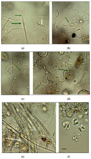 Alien phytoplankters in Bulgarian waterbodies: (a) Raphidiopsis raciborskii (straight trichome, thick green arrow points to its akinete, thin green arrow points to the heterocyst) and Raphidiopsis gangetica (white arrow points to its coiled trichome) in the inland microreservoir Mechka; (b) coiled trichomes of Raphidiopsis gangetica (thin green arrow points to the typical rounded heterocyst); (c) Raphidiopsis acuminato-crispa coiled around the straight trichome of Raciborskii raciborskii in Mechka (arrow indicates its pointed heterocyst); (d) Raphidiopsis acuminato-crispa in Mechka (thin green arrow points to the heterocyst, thick green arrow points to the akinete); (e) Aphanizomenon yezoense in the coastal lake Durankulak—aggregation of trichomes in a fascicle (long white arrow points to the akinete, short white arrow points to the long transparent apical cell, and green arrow points one of the heterocysts in the fascicle); (f) Tetrallantos lagerheimii—coenobium of bent cells from the small inland microreservoir Hadzhidimovo, black scale—5 µm, relevant to all figures.