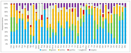 Relative contribution of main taxonomic groups to the phytoplankton biomass (calculated through the chlorophyll a concentration) according to the HPLC analysis of marker pigment composition in the studied Bulgarian waterbodies. Legend: cyano—cyanoprokaryotes, green—algae from both phyla Chlorophyta and Streptophyta, pyrrho—pyrrhophytes, eugleno—euglenophytes, ochro—ochrophytes, crypto—cryptophytes. Abbreviations of the names of the waterbodies are in accordance with Table 1.