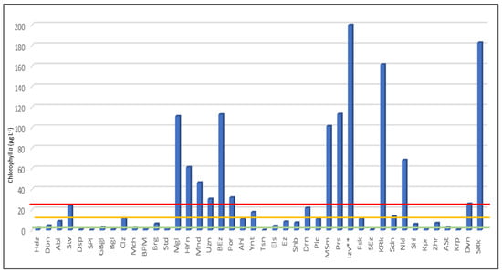 Chlorophyll a content (µg L−1) according to the HPLC analysis of marker pigment composition in the studied waterbodies. Green line indicates the upper border of oligotrophic waters (<1.5 µg L−1), yellow line shows the upper border of mesotrophic waters (1.5–10 µg L−1), and the red line indicates the upper border of eutrophic waters (10–25 µg L−1), above which waters were hypertrophic., The abbreviations of the names of the waterbodies are in accordance with Table 1. Asterisks indicate that the real value of chl a in Izvornik 2 was 765 µg L−1.