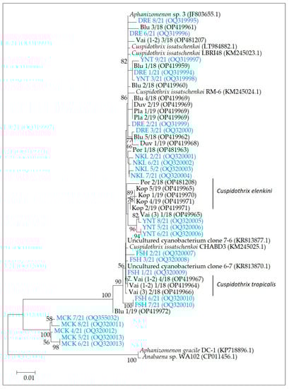 Neighbor-joining phylogenetic tree constructed after processing the samples from the 2021 summer phytoplankton using nucleotide sequences from five library samples indicated in blue and their closest sequences retrieved after a BLAST search [71] of the NCBI database [72]. Bootstrap values are shown at the branch points (percentage of 1000 trials) and an outgroup represented by Aphanizomenon gracile DC-1 and Anabaena sp. WA102. The 24 newly obtained nucleotides sequences are indicated by the abbreviated name of the waterbody, year of sampling and the relevant accession number in NCBI [72]: OQ3119995-OQ3200013. After the abbreviation, the number of the isolated sequence and after the slash, the year of the collection of the sample, are indicated. For the identical sequences obtained during this study, only one NCBI-derived accession number is provided in each cluster: OQ320003 for the Yunets clones 5 and 6, OQ320010 for the Studena clones 6 and 7, and OQ320013 for the Mechka clones 5 and 6. The following abbreviations are used for the waterbodies: Blu—Sinyata Reka (translated from its Bulgarian name as Blue River), DRE—Durankulak, Duv—Duvanli, FSH—Studena (due to the synonymous name Fishera), Kop—Koprinka, MCK—Mechka, Pla—Plachidol 2, Por—Poroy, Vai—Burgasko Ezero (from the synonymous name Vaya) and YNT—Yunets.