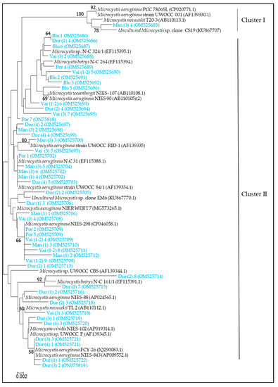 Neighbor-joining phylogenetic tree based on nucleotides sequences from ten library samples and closest sequences retrieved after a BLAST [71] search in the NCBI database [72] with indication of their accession number. Bootstrap values are shown at branch points (percentage of 1000 trials). Legend for the abbreviations of the waterbodies: Man—Mandra; Dur—Durankulak; Vai—Burgasko Ezero (Vaya); Por—Poroy; Blu—Sinyata Reka (Blue River) with Arabic numerals after the abbreviation, indicating the exact site of sampling and number of the sequence. For the identical sequences obtained during this study, only one accession number received from NCBI [72] is provided in each cluster or subcluster: (i) OM525686 is representing the sequences from the reservoir Sinyata Reka and site 4 of lake Durankulak (Blu 1 and Dur (1) 4); (ii) OM525702 is relevant for the sequences obtained from sites 1 and 3 of the reservoir Mandra, Poroy (Man (1) 4, Man (3) 6 and Por 1); (iii) OM525709 is for sites 1–2 from Lake Burgasko Ezero (i.e., Vai (1–2) 4, and Vai (1–2) 9) and for two sequences from the reservoir Poroy (Por 2, Poroy 5); (iv) OM525721 represents the sequences from sites 3 and 4 of Lake Durankulak (Dur (3) 3 and Dur (4) 1).