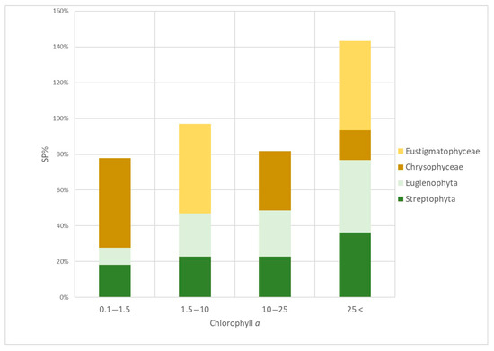 Cumulative species number in main taxonomic groups, expressed as a percentage of the total within the relevant phyla and classes (SP%), in waterbodies with different chlorophyll a concentration (µg L−1) as an expression of the trophic state [37].
