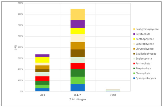 Cumulative species number in main taxonomic groups, expressed as a percentage of the total within the relevant phyla and classes (SP%), in waterbodies with different concentrations of total nitrogen [4,37].