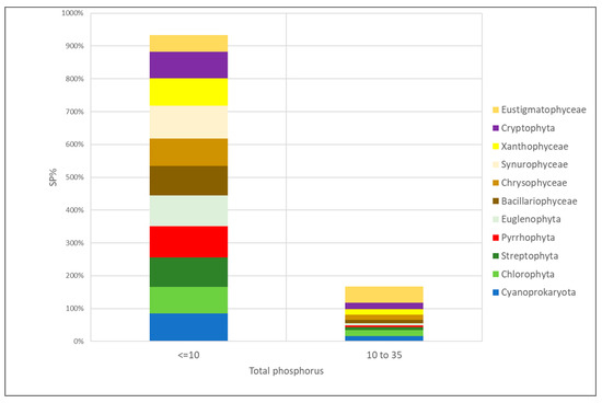 Cumulative species number in main taxonomic groups, expressed as a percentage of the total within the relevant phyla and classes (SP%), in waterbodies with different concentrations of total phosphorus (µg L−1).