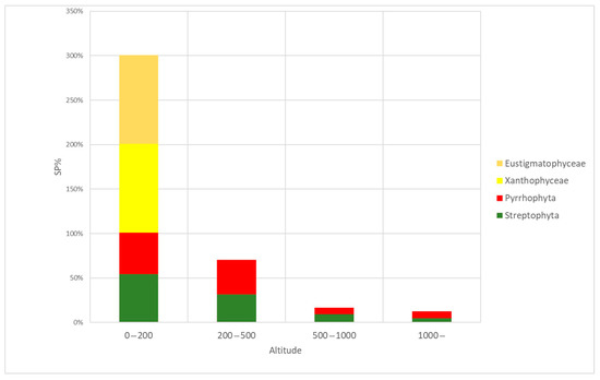 Although most species from all groups were found in lowland and plain waterbodies (0–500 m a.s.l.), the distribution of the following taxonomic groups was more specific according to the altitude location: xanthophyceans and eustigmatophyceaens were spread only in the lowland waterbodies (0–200 m a.s.l.), while pyrrhophytes and streptophytes occurred in all altitude groups but had a preference for lowland and plain waterbodies (Figure 13).