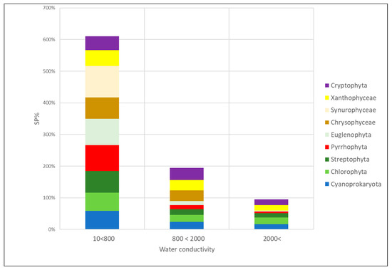 Cumulative species number expressed as a percentage of the total within the phyla and classes (SP%), in waterbodies of different conductivity values (S m−1), classified after [37].