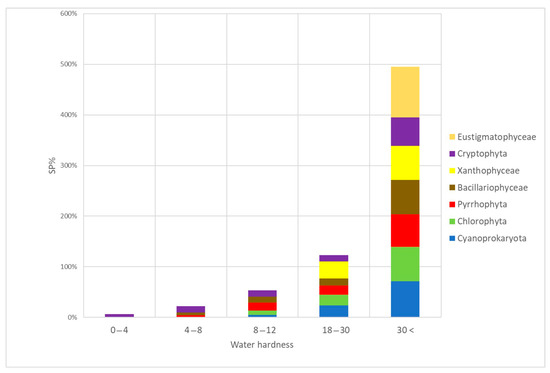 Cumulative species number expressed as a percentage of the total within the phyla and classes (SP%), in different waterbodies according to the water hardness (°dh), classified after [37].